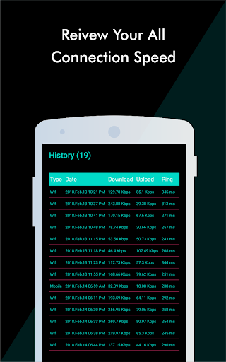 Ten test prędkości sieci pokazuje istotne parametry szybkości testu internetowego: Prędkość pobierania, przesyłania, ping. Poza tym można nie tylko sprawdzić szybkość Wi-Fi i mobilnej danych od czasu do czasu, ale także nagrywać dane w historii, aby przejrzeć go w razie potrzeby. W ten sposób będziesz mógł przeanalizować właściwe wahania prędkości i wyeliminować wszelkie problemy w czasie z tym testem jakości Internet.
