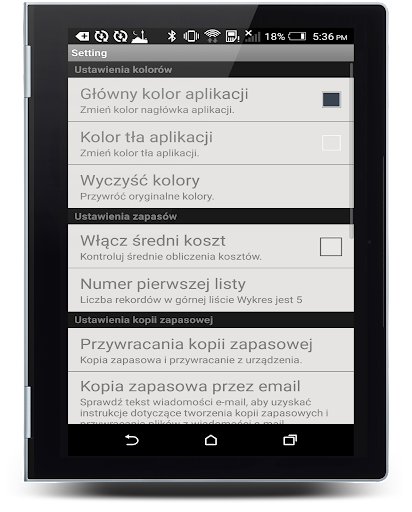 o Ustawienie: funkcje aplikacji sterujących, takie jak tworzenie kopii zapasowych danych, używanie hasła i inne.