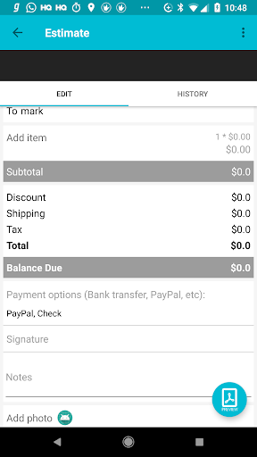 Invoice and Estimates is perfect for contractors, small business owners and freelancers needing a simple and professional mobile invoicing solution. Create, send and track invoices and estimates easily on your phone. Create an unlimited number of invoices. With this, you'll be invoicing your customers in no time and sending professional PDF invoices with ease. Send the invoice before you even leave the customer!