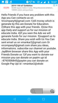 Jaybhim Browser is a fast and secure browser. This app does not Store your Data Like other browsers. 50% earning of this App is used for education purpose