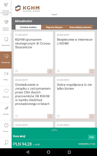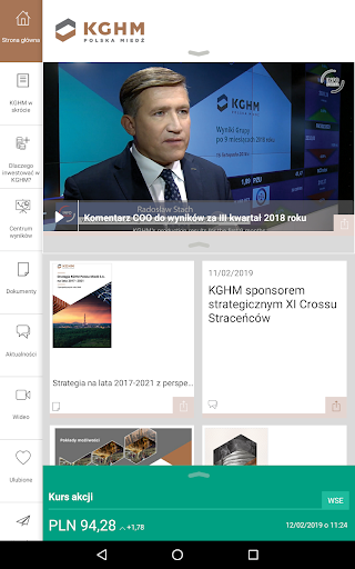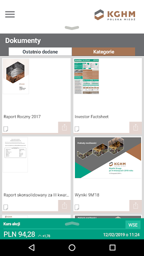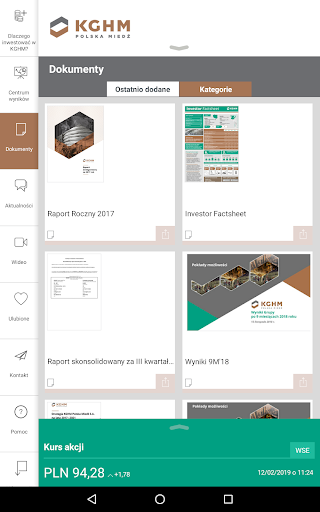Aplikacja mobilna KGHM to narzędzie Relacji Inwestorskich, które zawiera dokumenty, wideo oraz interaktywne wykresy, które nie tylko umożliwiają naszym akcjonariuszom i inwestorom dostęp do informacji dotyczących działalności korporacyjnej Spółki KGHM, ale również oferuje dostęp offline do wszystkich innych zagadnień.