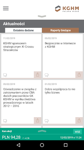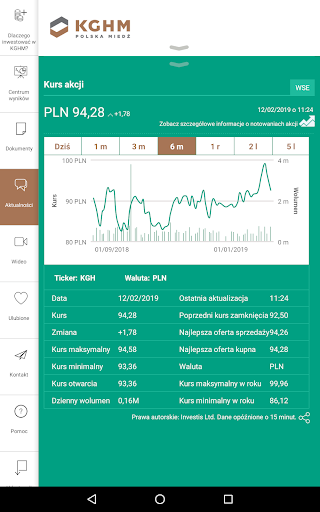 Aplikacja dostarcza wszystkich najważniejszych dla inwestora informacji – zarówno w trybie online, jak i bez dostępu do sieci – dzięki opcji pobierania materiałów. Aplikacja gwarantuje dostęp do nowo opublikowanych informacji prasowych, raportów bieżących, sprawozdań finansowych i prezentacji wynikowych. Ponadto aplikacja zawiera informacje o statystykach notowań akcji KGHM na GPW.