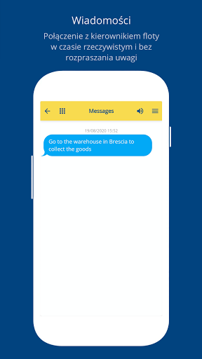 - łączenie się z menedżerem floty za pomocą wiadomości w czasie rzeczywistym, bez rozpraszania się podczas jazdy (głosowe odczytywanie wiadomości);