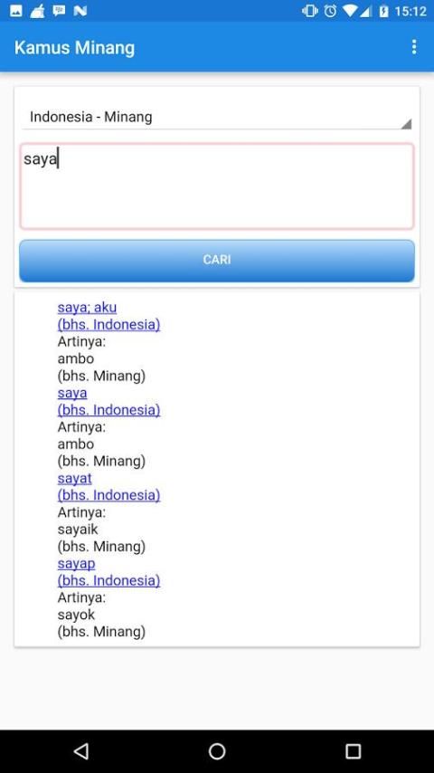 This application contains a database of translations Minang-Indonesian and Indonesian-language Minang. You can use this application to everyday needs or to get to know more of the Indonesian Minang language.