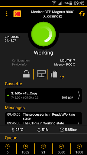 • App shows whether CTP device is running or stopped for any reason, plus detailed information such as current job, jobs in the queue, active plate cassette count, environmental conditions, event history, and more.