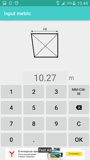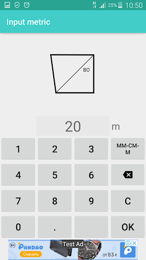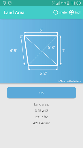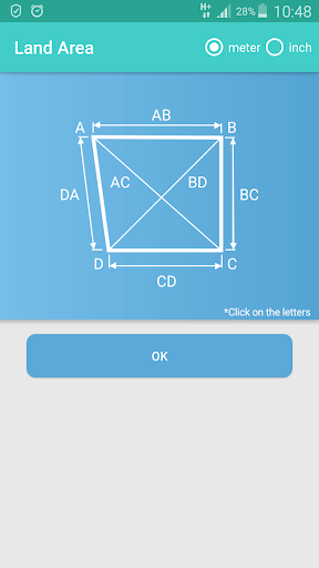 Calculate area of 4 angle land. You have to insert 4 sides length and one angle or diagonal. Meters and Ft-Inches With Ads