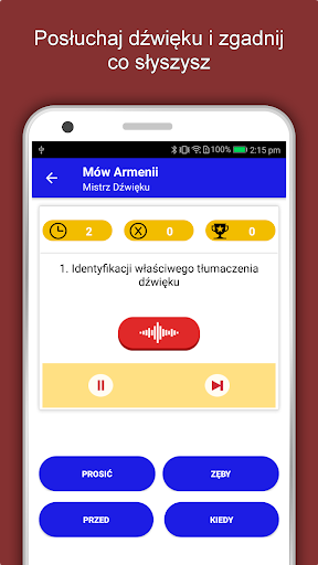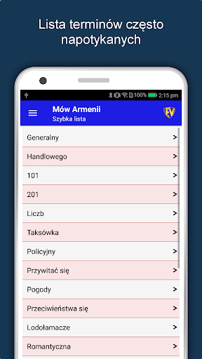 Aplikacja nauczania w trybie offline w języku armeńskim zawiera 2135 słów z 55 kategoriami. Zawiera wymowę, obrazy i fonetykę słów ułatwiających naukę. Przełączanie języka bazowego, zapisywanie informacji w EduBank℠, grach audio, Potpourri i grach retencyjnych są głównymi funkcjami programu mówić ormiański.