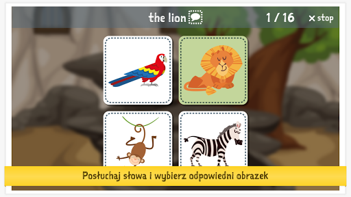 Słowa: parrot, lion, monkey, zebra, elephant, giraffe, camel, i 9 więcej!