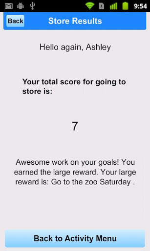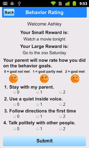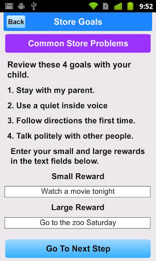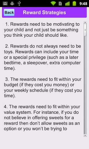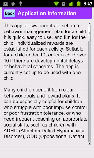 Każda aktywność ma link do dodatkowego ekranu, który opisuje typowe powody problemów zachowań i strategii rodzicielskich, które można wykorzystać wraz z planem nagrody. Inne specjalne ekrany dostarczają przydatnych wskazówek na temat ustawiania bramki i strategii nagród.