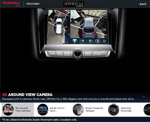 Wysoce wciągająca treść i przyjazny dla użytkownika interfejs tej aplikacji wyjaśnią wszystkie funkcje produktu z bogatą zawartością.Konsultant ds. Sprzedaży może również porównywać poszczególne warianty produktu, które pomogą klientowi, kupić SUV z jego wyboru.