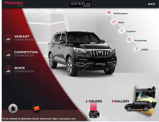 Mahindra World of SUV to rozwiązanie jednokierunkowe, w którym konsultant ds. Sprzedaży może doświadczyć wszystkich nowych SUV -ów Mahindry, za dążeniemPrzycisk na tabletach.