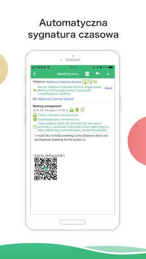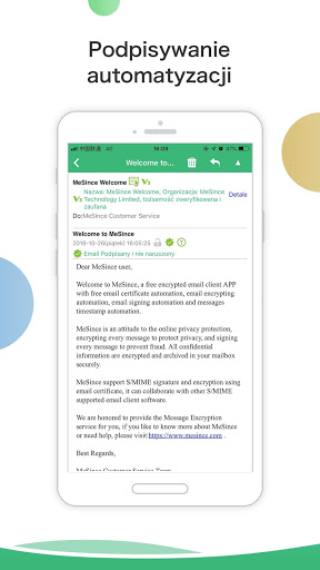 MePodpis App jest zaszyfrowanym klientem e-mail, który jest bezpłatny i łatwy w użyciu.Nie ma potrzeby rejestracji nowego konta e-mail.Po prostu pobierz aplikację MePodpis i zaloguj się na swoje istniejące konto e-mail.Za kilka chwil, Twój darmowy certyfikat e-mail zostanie automatycznie zainstalowany, a ty możesz zacząć wysyła ć zaszyfrowane i cyfrowo podpisane e e e-maile tak łatwo, jak zwykłe wiadomości.Twoje maile będą przechowywane tylko na serwerze e-mail.Twoja prywatność e-mail będzie od końca szyfrowanie chronione.