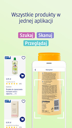 Dzięki naszej funkcji wyszukiwania, kategoryzacji produktów i funkcji skanowania szybko i łatwo możesz przeglądać naszą ofertę produktów. Wystarczy kliknąć w nasz asortyment, wyszukać konkretne marki lub zeskanować produkty, wyświetlić wcześniej zakupione produkty, dodać je do listy życzeń lub od razu rozpocząć zakupy.