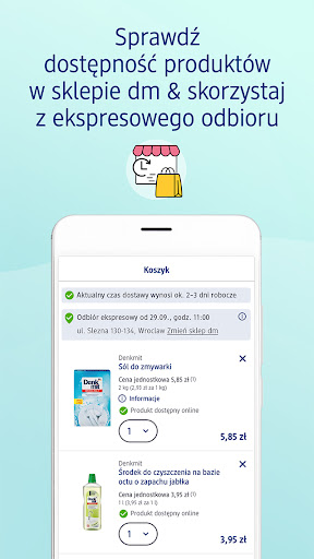Możesz wyszukać sklepy dm w swojej okolicy korzystając bezpośrednio z wyszukiwarki oddziałów. Tym samym uzyskasz łatwy i szybki dostęp do informacji o usługach z wszystkich sklepów dm. Ponadto możesz zapamiętać swój preferowany sklep dm w aplikacji. Dzięki temu, oprócz dostępności produktów online na poszczególnych stronach, uzyskasz też podgląd zapasów w wybranym sklepie dm. Po zapamiętaniu sklepu dm możesz również sprawdzać swój koszyk w usłudze ekspresowego odbioru i skorzystać z tej nowej metody dostawy.