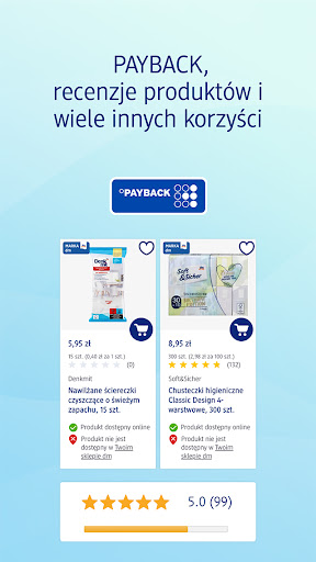 Co powiesz na sprytny kieszonkowy sposób na zakupy? W aplikacji Mój dm, oprócz możliwości zakupu ulubionych produktów, masz również dostęp do naszych usług PAYBACK. Dodatkowo znajdziesz tu zbiorczy podgląd wszystkich swoich kuponów. Logujesz się poprzez istniejące konto klienta dm, co oznacza, że aplikacja jest dostosowana do Twoich potrzeb.