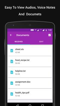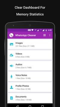 ✔ Dashboard that shows memory statistics for different categories like images, audios, videos, profile pictures, wallpapers, voice notes and documents.