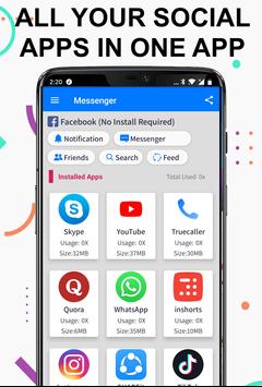 - Instantly access these apps for free in a single click - Facebook Messenger, Messenger Lite, WhatsApp, Wechat, Snapchat, Telegram, Flipchat, Messages, Instagram, Twitter, LinkedIn, Gmail, Quora , TikTok, Musically etc.