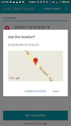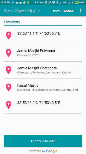 The newly added Location will be added to your Musjid List and now your Phone will be automatically put on SILENT Mode when you Enter into Musjid and Put back on NORMAL Mode when You leave Musjid. You can add as many Musjids as you want.