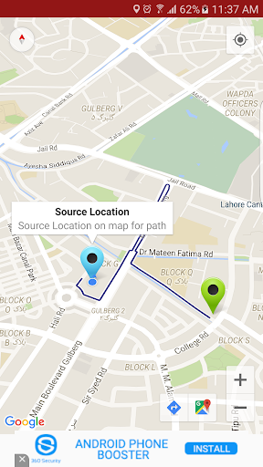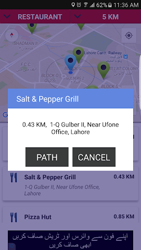 3.USER może znaleźć szczegóły dotyczące dowolnego miejsca Albo patrząc na liście pokazanej poniżej mapy lub stukając dowolnego żądanego znacznika wyświetlanego na mapie. Po dotknięciu na znaczniku pojawi się wyskak na wyświetlanie nazwy, odległości, adresu miejsca i dwóch przycisków I.e "Anuluj", "ścieżka".