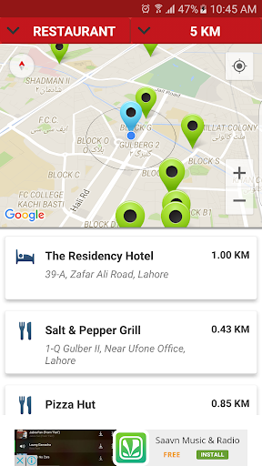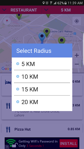 2. Użytkownik może zmienić jego promień odległość np. 5 km, 10 km, 15 km, 20 km itp ze swojej aktualnej lokalizacji, stukając opcję "km" opcja wyświetlana w górnym barze. Po ponownym stuknięciem aplikacji do góry Pasek ponownie pobiera miejsca w wybranym promieniu i wyświetla je na mapie w formie markerów i w formie listy poniżej mapy.