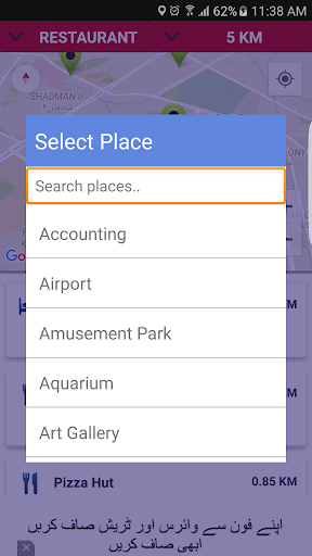 1. Użytkownik może zmienić miejsce typu e.g. Szpital, szkoła, uniwersytet itp., Stukając typ miejsca wyświetlany w górnym pasku aplikacji. Po stukaniu na górnym pasku wyświetla listę rodzajów miejsc. Wybierając dowolną aplikację, rozpoczyna pobieranie miejsc, a następnie wyświetla je na mapie w formie markerów i w formie listy poniżej mapy.