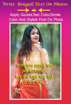 Welcome to my new write Bengali Text On Photos apps . Use the application to write Bengali poems, Shayari, Quotes, Funny Jokes and Baby Names on any photo. You can write your Bengali Name on your own photo too. Bengali Text On Photos create application that allows best photo text creator photo with many items photo or image. You can Write Bangla Shayari, Your Name on photo in Bangla, Bangla Poetry, Bangla Suvichar, Bangla Gazal, Bangla Jokes, Bangla Poem and Messages easily with the help of Bangla keyboard on your selected photo from gallery or camera.