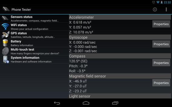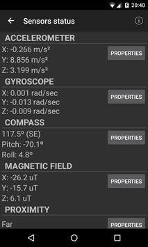 Będziesz mógł sprawdzić, które czujniki są obsługiwane przez Twój telefon oraz wszystkie informacje i wartości dostarczane przez każdy czujnik. Akcelerometr, żyroskop, kompas, czujnik zbliżeniowy, czujnik ciśnienia ...