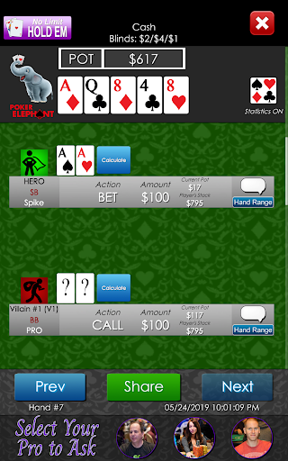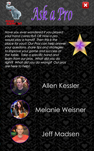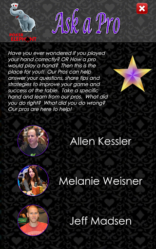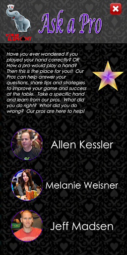 chcesz wiedzieć, czy dobrze go grałeś? Chcesz wiedzieć, jak możesz się poprawić? Zapytaj pro! Prześlij rękę do jednego z najnowocześniejszych graczy w pokera, który jest 10 miejscem w całym czasie z ponad 300 kasami turniejowymi i prawie 4 milionami dolarów w zarobkach kariery, Allen "Chainsaw" Kessler lub jedna z najbardziej osiągniętych żeńskich graczy wszechczasów z ponad 30 WSOP Cashes, Melanie Weisner! Dowiedz się rozwiązania do pokera konundrum prosto z ust ust. Otrzymasz dogłębną opinię, która może pomóc Ci zabrać grę na następny poziom, zwiększając wiedzę i zrozumienie gry.