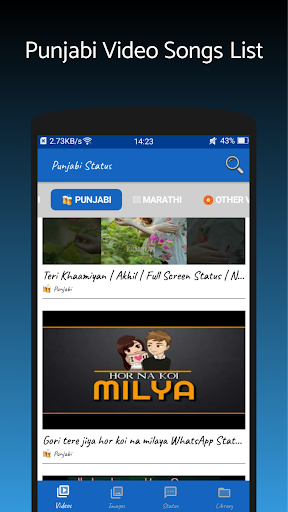 App contains various punjabi video status like new latest punjabi songs ,punjabi sad songs ,old punjabi songs,all new punjabi songs ,top punjabi songs,punjabi music save,punjabi geet,Hit Punjabi Song,Punjabi top hit songs,Punjabi Love Songs,Punjabi super hit song,Punjabi New Songs,Punjabi Old Songs,Punjabi Folk Songs,Diljit Dosanjh songs video,Gippy Grewal songs video,Amrinder Gill songs video,Yo Yo Honey Singh songs video,Badshah songs video,Kulwinder Billa songs video,J Star songs video,Jassi Gill songs video,Happy Raikoti songs video,Mankirt Aulakh songs video,Bohemia Punjabi Rapper songs video,Millind Gaba songs video,Babbu Maan songs video,Jazzy B songs video,Garry Sandhu songs video,Bilal Saeed songs video,Hardy Sandhu songs video,Geeta Zaildar songs video,Pav Dharia songs video,Prabh Gill songs video,Preet Harpal songs video,Raftaar songs video,Ranjit Bawa songs video,Roshan Prince songs video,A-Kay songs video,Alfaaz songs video,Dilpreet Dhillon songs video,Mehtab Virk songs video,Ninja Punjabi Singer songs video,Sharry Mann songs video,Sukhe Muzical Doctorz songs video,Amrit Maan songs video,Babbal Rai songs video,Chenny Bains songs video,Dr Zeus songs video,Falak Shabir songs video,Akhil songs video,Gagan Kokri songs video,Galav Waraich songs video,Gitta Bains songs video,Guru Randhawa songs video,Gurvinder Brar songs video,Hardeep Grewal songs video,Harshit Tomar songs video,Harsimran songs video,Ikka songs video,Inder Chahal songs video,Inderjit Nikku songs video,Jaggi Sidhu songs video,Jassi Jasraj songs video,Teg Grewal songs video,Veet Baljit songs video,Yuvraj Hans songs video,Zora Randhawa songs video and many other punjabi songs.