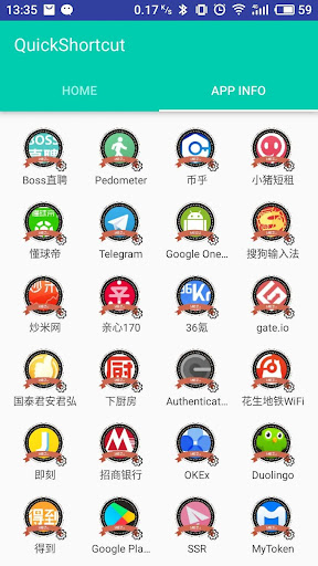 [ You can quick launch any app info installed in your smartphone. This feature is a great tool and useful to developers, because they had to check the app info step by step, from the home page, and then setting and next... maybe 10 seconds later then they get the app info. So it's boring. Now , they just need tap the short cut key in the homepage , then get the app info immediately]