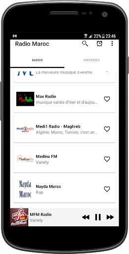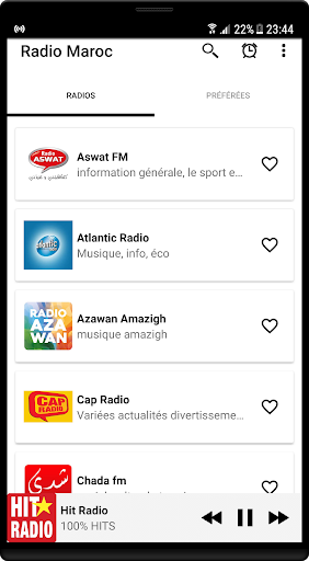 Słuchaj swoich ulubionych stacji radiowych bez zestawu słuchawkowego, takie jak: Medi 1, Med Radio, Chada FM ASWAT, Radio March, Radio Atlantic, Radio 2m, Casa FM, Radio Cape, radio, radioplus Casablanca, Radio Medina FM FM , Medi1, Medria, BEUR FM, Radio Sawa, Radio Plus, MFM Radio, Snrot - Chain Inter, Snrt - Łańcuch M6 Koran, Snrot - Amazigh Chain, Snrt - łańcuch narodowy, Hit Radio Buzz, Hit Radio Cover, Hit Radio Dancefloor, Udaj się złoto radiowe Radio Mgharba, Hit Radio Pop / Rock, Hit Radio RNB, Anwarock, BEUR FM, Francja-Maghreb Maroko, Radio MFJ, Sawte Ouarzazate, tylko Rai, Radio Sun, Campus Agadir, Monte Carlo Doualiya.
