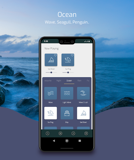Fale oceanu są popularnym wyborem do kojących dźwięków snu. Dla wielu ludzi rytmiczny rozbijający się wodę na piasek i skale może być medytacyjny. W tej aplikacji istnieje wiele rodzajów oceanu brzmi jak falę, mewa, żaglówka i więcej.