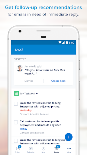 Salesforce Skrzynka odbiorcza przynosi e-mail, kalendarz i światowy CRM na świecie w jednej aplikacji.Wysłany przez Einsteina, Skrzynka odbiorcza wykorzystuje sztuczną inteligencję, aby pomóc powtórzeniom sprzedawcom sprzedawać mądrzejszy.Aplikacja zapewnia kontekst kontekstowy na dzisiejsze wydarzenia i zaleca działania następcze, więc ważne możliwości nigdy nie poślizgną się przez pęknięcia.Zautomatyzuje czasochłonne zadania administracyjne do zwiększenia wydajności sprzedaży i pozwala powtórzenia handlowe koncentrować się na tym, co robią najlepiej - zamykając transakcję.Uzbrojenie Użytkownicy z bezproblemowym dostępem do kluczowych spostrzeżeń i potężnych danych Salesforce, krytyczne rozmowy klienta są bardziej znaczące i produkcyjne niż kiedykolwiek wcześniejOgraniczony zestaw funkcji skrzynki odbiorczej są również kompatybilne z Salesforce IQ CRM.