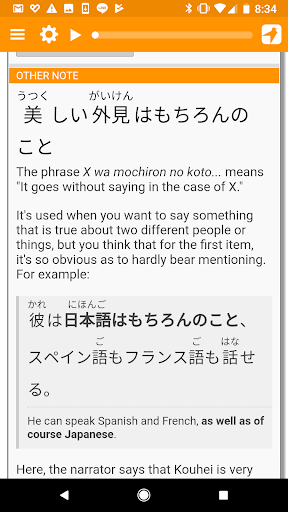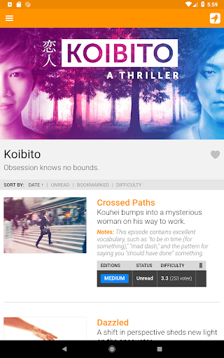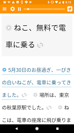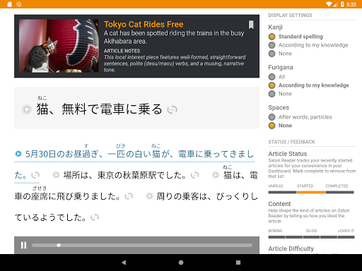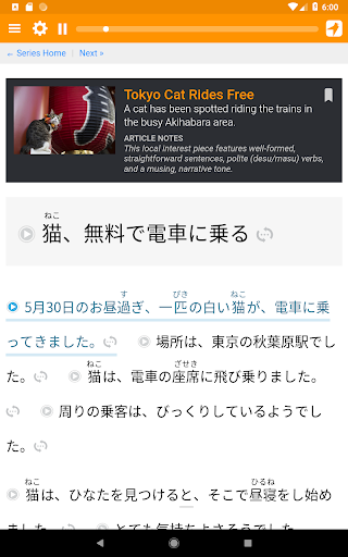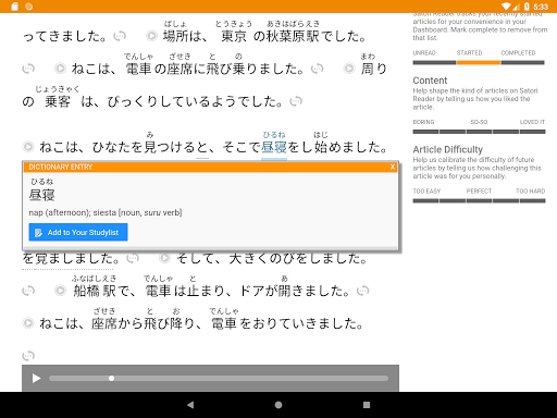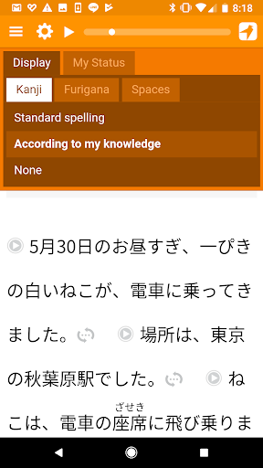 Dotknij dowolne zdanie, aby usłyszeć na głos przez rodzimych aktorów głosowych (bez robotów!) Unikalny silnik prezentacji, który dostosowuje japoński tekst, aby pomieścić twoją rzeczywistą wiedzę. Pozwala to rzucić wyzwanie dla Kanji, które powinieneś wiedzieć bez przytłoczenia tego, co nie.