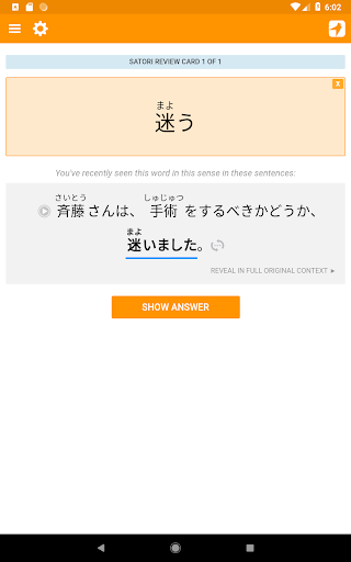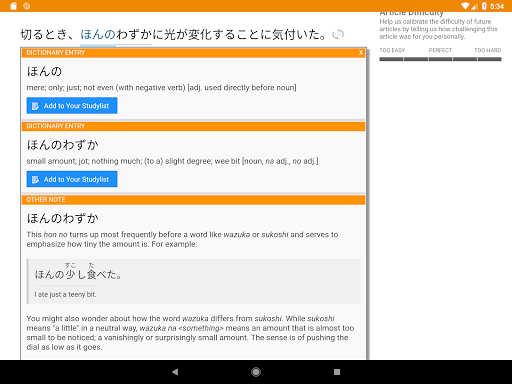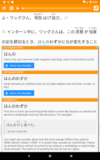 Dotknij dowolnego słowa do definicji. To więcej niż tylko zautomatyzowane wyszukiwanie. Czytnik Satori pokazuje rzeczywiste sens każdego słowa, ponieważ jest używany w zdaniu. Na przykład cząstka の ma wiele zastosowań: może wskazywać posiadanie; Może odwrócić poprzedni czasownik lub frazę do rzeczownika; może stać na kolejne słowo; i więcej. Pokażemy Ci dokładnie, co dzieje się w każdym przypadku każdego słowa.