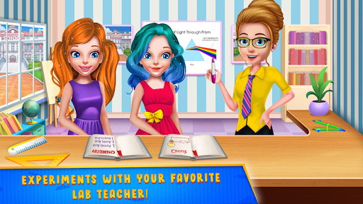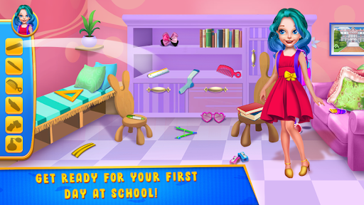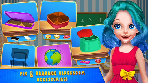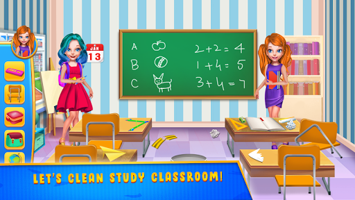 Make yourself ready for this awesome school game where you will learn a few things and you will also have a lot of fun accomplishing some tasks. The first day at school might be overwhelming for these two best friends, so your job will be to go through the day with them. You will begin your challenge at home because here is where you will find suitable clothing for this special day. Find the misplaced items from the room and help this beautiful girl get ready. Once the dressing up step is conquered you can take the girls at classes where your next activity awaits. This step implies cleaning the study classroom and repairing the damaged objects around. Throw away the garbage, and try to fix the broken items or to replace them if there's nothing you can to fix them. Follow the instructions and make this classroom an appropriate one for pupils to study and learn new things. You will also have to go to the canteen where you will make and serve delicious food to the others. Try to respect the recipe for each food you serve and make them delicious for your clients. The canteen menu will include drinks, pizza, burgers and other yummy meals. Serve the kids and collect the money for your plates. Now that you've clean and cook you can go to the science classroom where you are about to do some cool experiments. Learn something about electricity and try to pay attention to the chemistry lesson. Now you know exactly what it takes to have a perfect first day at school and you can continue your training by playing the game again.