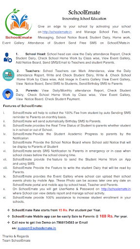 Szkoła E-Mate to najbardziej zaawansowana oprogramowanie do zarządzania szkołą i system zarządzania szkolnymi ze szkoły mobilną aplikacją.Jest to kompletna oprogramowanie ERP szkolne do zarządzania (wstęp, obecność, badanie, znak marki, opłat, przesyłanie wiadomości itp.) Dla nieograniczonych studentów.