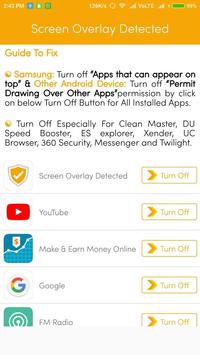 Now you can easily fix screen overlay detected error in android device by one click. This application work for any android device like smasung, xiaomi, redmi, lg, moto, etc.