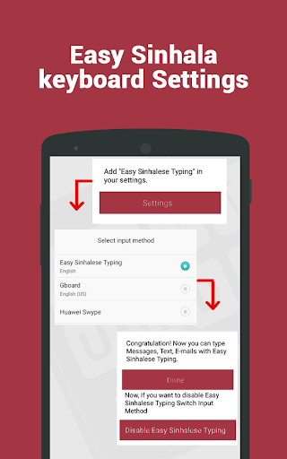 Po zainstalowaniu klawiatury Sinhala na Androida, możesz bezpłatnie korzystać, naciskając "Włącz klawiaturę" i wybierz tę klawiaturę. Ta klawiatura działa jako domyślna klawiatura w telefonach z systemem Android / tablety do pisania / SMS-ów. Wystarczy wpisać w języku angielskim i naciśnij spację, Twoje angielskie słowo zostanie automatycznie konwertowane na skrypt Sinhalski.