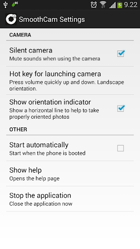 A fine companion for your favorite camera application! Automatically turns the phone to silent mode to disable shutter sounds. Also allows you to use the power/volume key as a camera launcher.