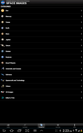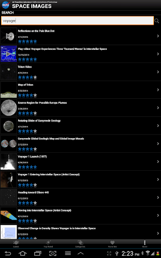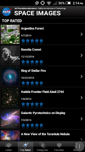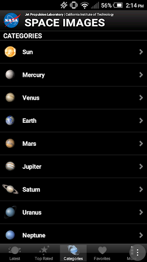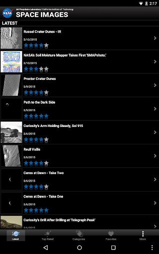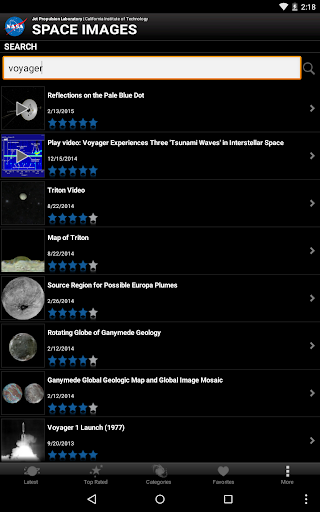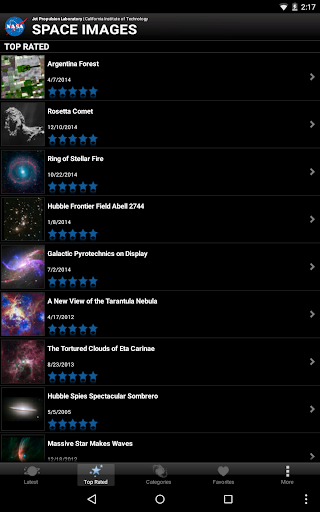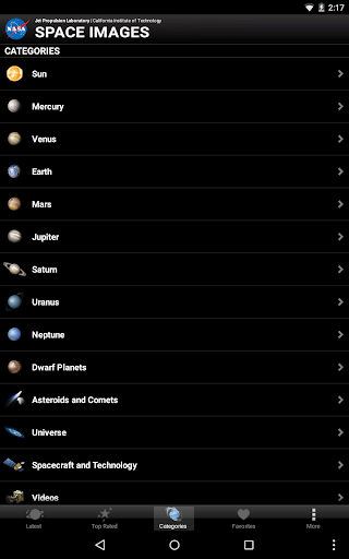 NASA/JPL's Space Images app offers a unique view of the sky via hundreds of images taken by spacecraft studying planets, stars, galaxies, weather on Earth and more. Save to your device as backgrounds or wallpaper and share them with friends on Facebook, Twitter and email as you scan through our extensive photo albums and rate your favorites.