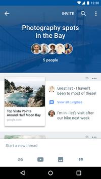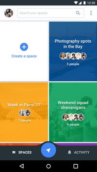 Create a space in one tap, and invite people any way you like with a quick link. With Google Search, Chrome, YouTube, and Google Photos built in, you can find and share articles, videos, and photos from within the app. And when you need to get back to something you recently saw in one of your spaces, use the search feature to find it in a snap.