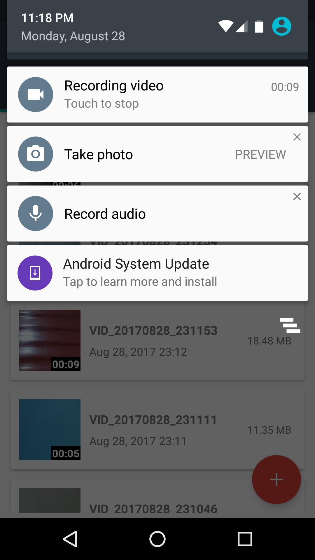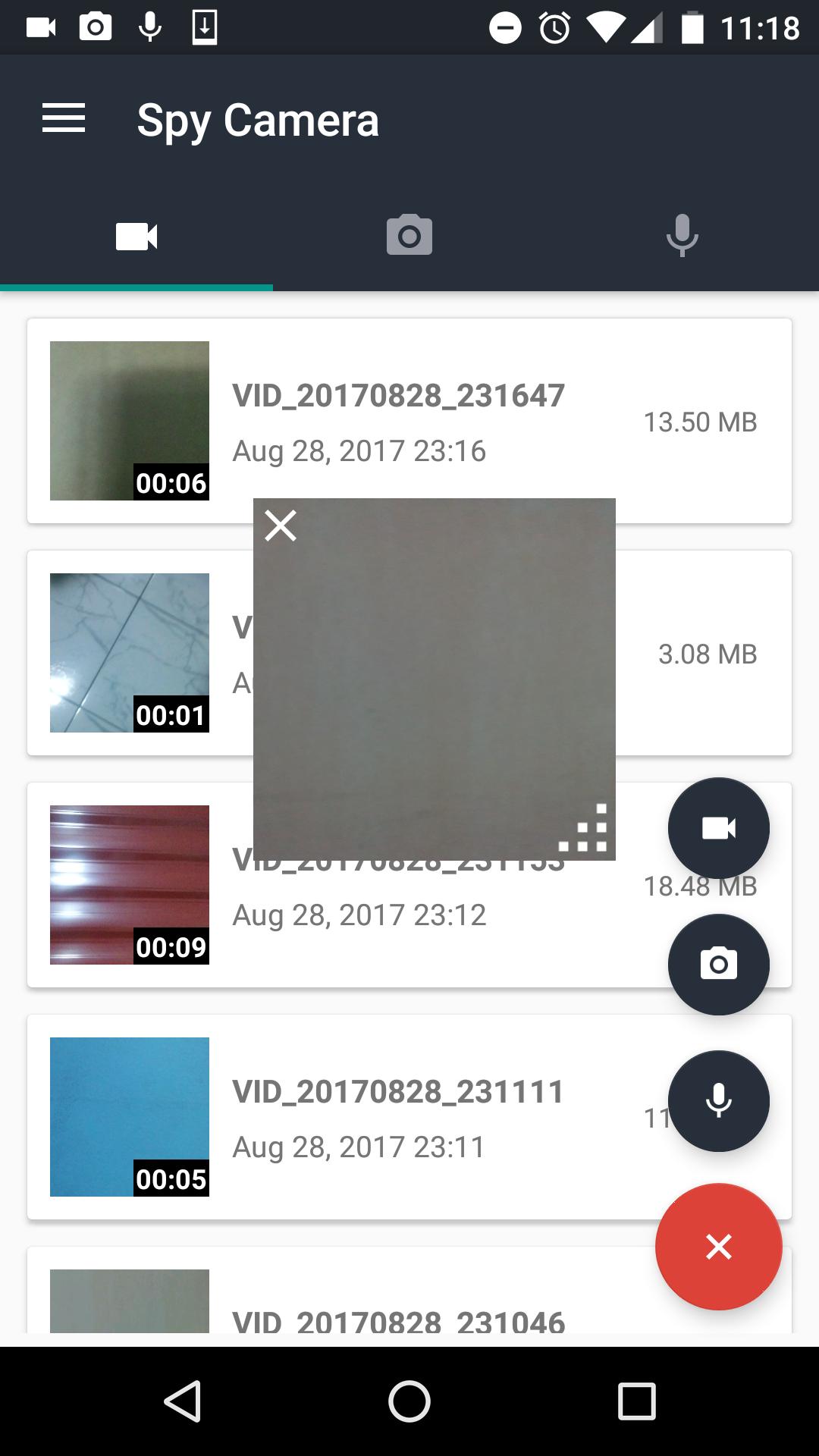 "Spy Camera & Audio Recorder" helps you to record video/audio and take pictures in background using discrete notifications. It works even with the app closed, with screen-off/locked and while other apps are running.