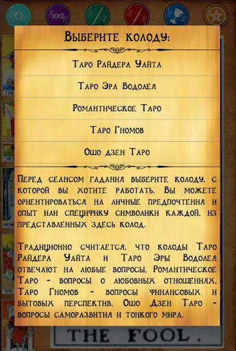 Szczegółowy opis każdej arcany i dodatkowych materiałów dla tych, którzy chcą wiedzieć o Tarota. Arkans w każdym pokładzie ma unikalne interpretacje autora