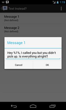 Text Instead? recognizes your outgoing calls without an answer and offers you advanced features like sending messages that you can pre-define and customize for sending after an unsuccessful outgoing call you make, calling that person again and setting a reminder to try again later.