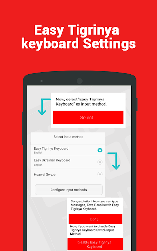 Po zainstalowaniu klawiatury Tigrinya na Androida możesz bezpłatnie korzystać, naciskając "Włącz klawiaturę" i wybierz tę klawiaturę. Ta klawiatura działa jako domyślna klawiatura w telefonach z systemem Android / tablety do pisania / SMS-ów. Wystarczy wpisać w języku angielskim i naciśnij spację Twoje angielskie słowo zostanie automatycznie przekształcone w skrypt Tigrinya.