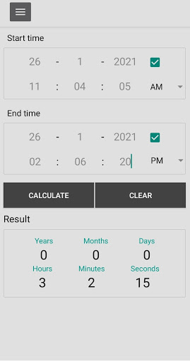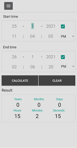 Aplikacja umożliwia obliczenia proste i szybkie obliczenia czasu.Możesz uzyskać czas trwania lat, miesięcy, dni, godziny, minuty i sekundy między dwoma datetami.