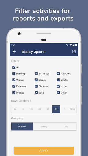 • Łatwy -To-używać filtrowania, aby ograniczyć eksportowane dane do typowych typów, takich jak rozliczane lub płacone godziny pracy.