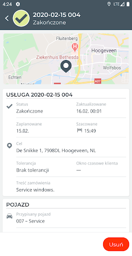 Zamówienia: Wysyłanie nowych zleceń i podgląd realizacji zamówień dla wybranego pojazdu, łącznie z lokalizacją pojazdu obsługującego zlecenie oraz przewidywanym czasem przybycia.