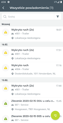 Powiadomienia/ostrzeżenia: Otrzymuj natychmiastowe powiadomienia za każdym razem, gdy pojazd wjeżdża lub wyjeżdża z uprzednio wyznaczonego obszaru geograficznego lub gdy zmienia się status zamówienia.